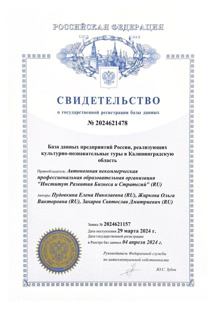Студентка специальности «ТУРИЗМ» Ольга Жиркова закрепила своё авторство «Базы данных предприятий России, реализующих культурно-познавательные туры в Калининградскую область».