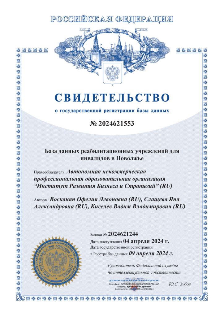 Студенты ИРБИС регулярно получают патенты на собственноручно созданные базы данных. Патент от Федеральной службы по интеллектуальной собственности подтверждает значительные усилия, приложенные для сбора и систематизации данных студентами. Полученный документ охраняет способ систематизации данных, которые собрали студенты, упрощает внесение ПО в реестр Минцифры и передачу прав по договорам. Это официальное подтверждение системной работы учащихся и важная составляющая выпускных квалификационных работ наших студентов.